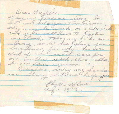 Thank you, Phyllis Glover, for your 37-year-old reminder to show compassion to our neighbors. More than any commandment, may this become our duty and our privilege. May we all find the time to “care for one another, walk others paths, know their sorrows.”